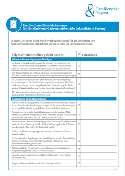 Anhand der zugehörigen Checkliste werden die die wichtigsten Punkte für die Einführung von familienfreundlichen Maßnahmen auf einen Blick zusammengefasst.