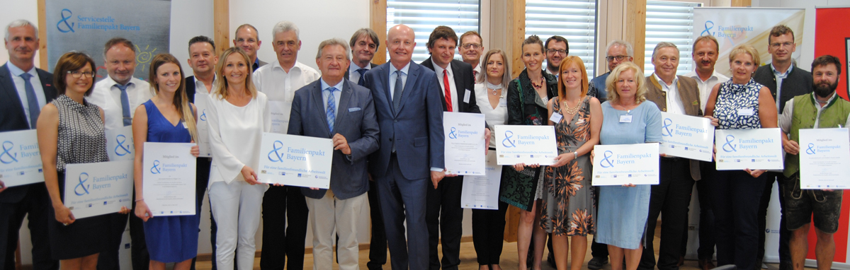 „Eine familienfreundliche Arbeitskultur ist heute Kriterium Nummer Eins bei der Wahl des Arbeitsplatzes. Unternehmen, die es ihren Beschäftigtenermöglichen, Familie und Beruf zu vereinbaren, denken auch an ihre eigene Zukunft. Damit Familienfreundlichkeit gelingt, unterstützen wir Unternehmen mit dem Familienpakt Bayern. Unabhängig von der Größe und der Branche erhalten sie im Familienpakt Bayern Informationen, Impulse und neue Ideen. Denn individuelle Lösungen sind in jedem Betrieb möglich. Mit der neuen Plakette ‚Familienpakt‘ können Mitgliedsunternehmen dies nun auch nach außen sichtbar machen“, so Amtschef Michael Höhenberger.